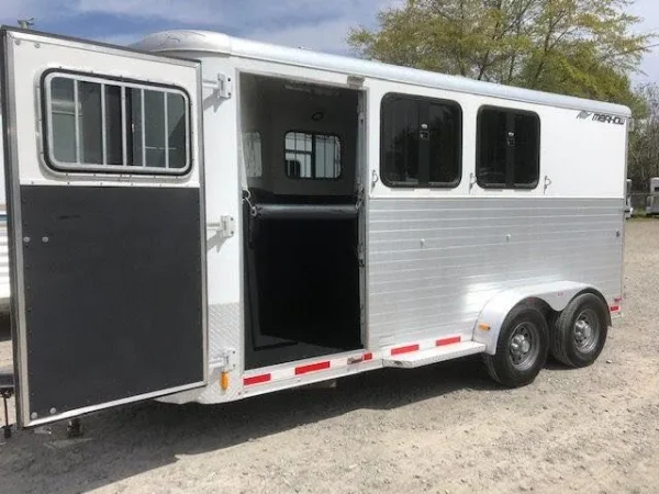 Super nice, lightly used 2010 Merhow 3 horse bumper pull trailer. This trailer is in fabulous condition! It is 7′ tall, 6’9″ wide and 17′ long. It has the following features: -3 horse slant load floor plan -Drop down windows at head side with bars -Sliding windows on hip side -Escape door from 1st stall -Stud wall divider -Lined and insulated roof -Roof vents per stall -Interior fans -Collapsible rear tack with bridle hooks, brush box, carpeted door and wall -Removable saddle rack -Front dressing room with swing out blanket bars, -Extruded aluminum sides -Factory added rear ramp -Exterior load light -Interior lights -6 exterior tie rings Trailer is in excellent condition
