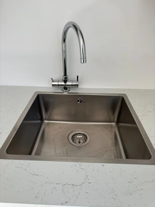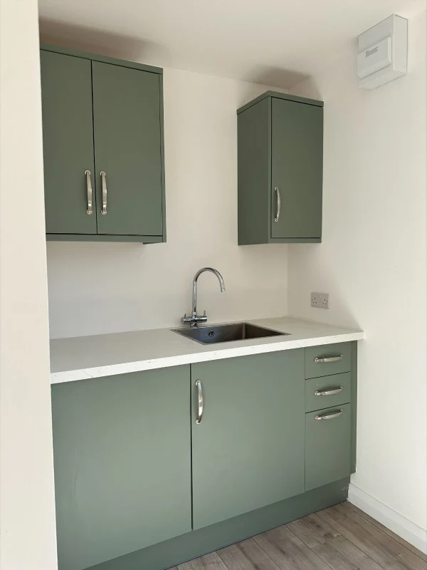 7.5 X 3M Office – Constructed using Composite Insulated Panels – Double glazed UPVC windows and doors – Woods effect planked floor -External light -Complete with fitted kitchen including intergrated fridge and water heater – includes 2 electric panel heaters – fully wired with electrical sockets -fitted bathroom (toilet and wash basin)